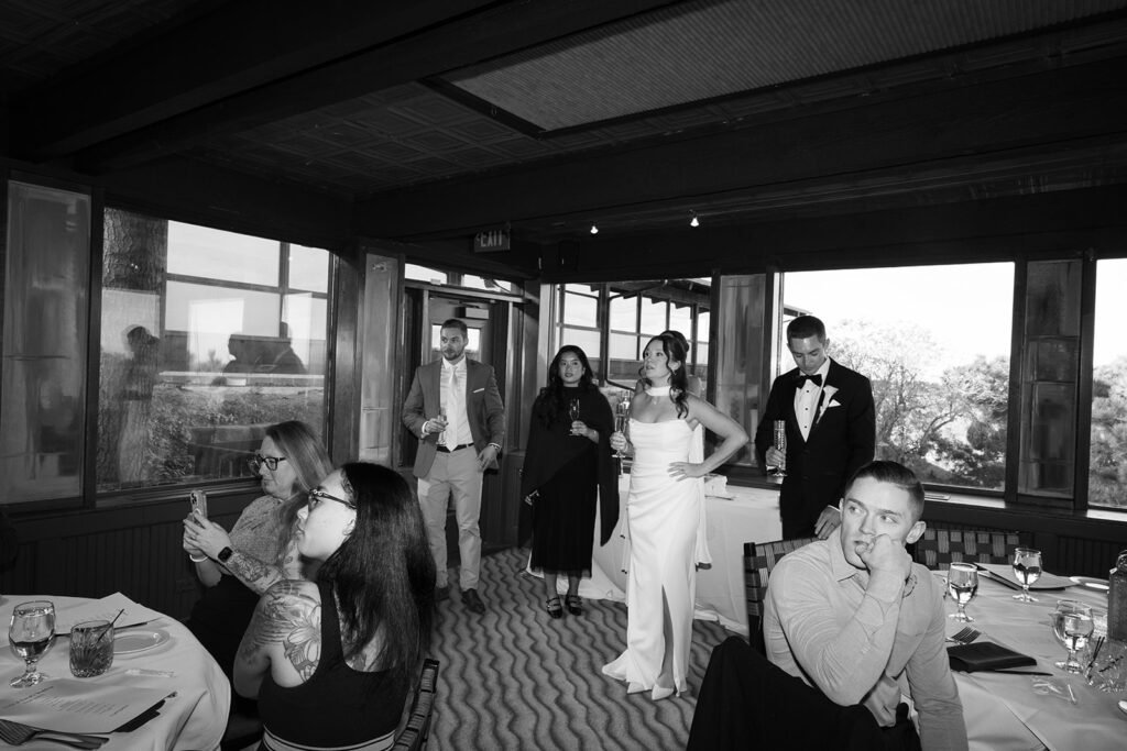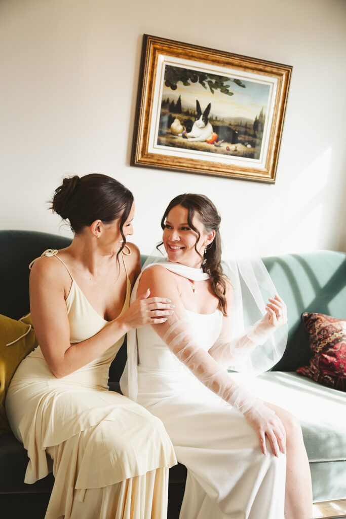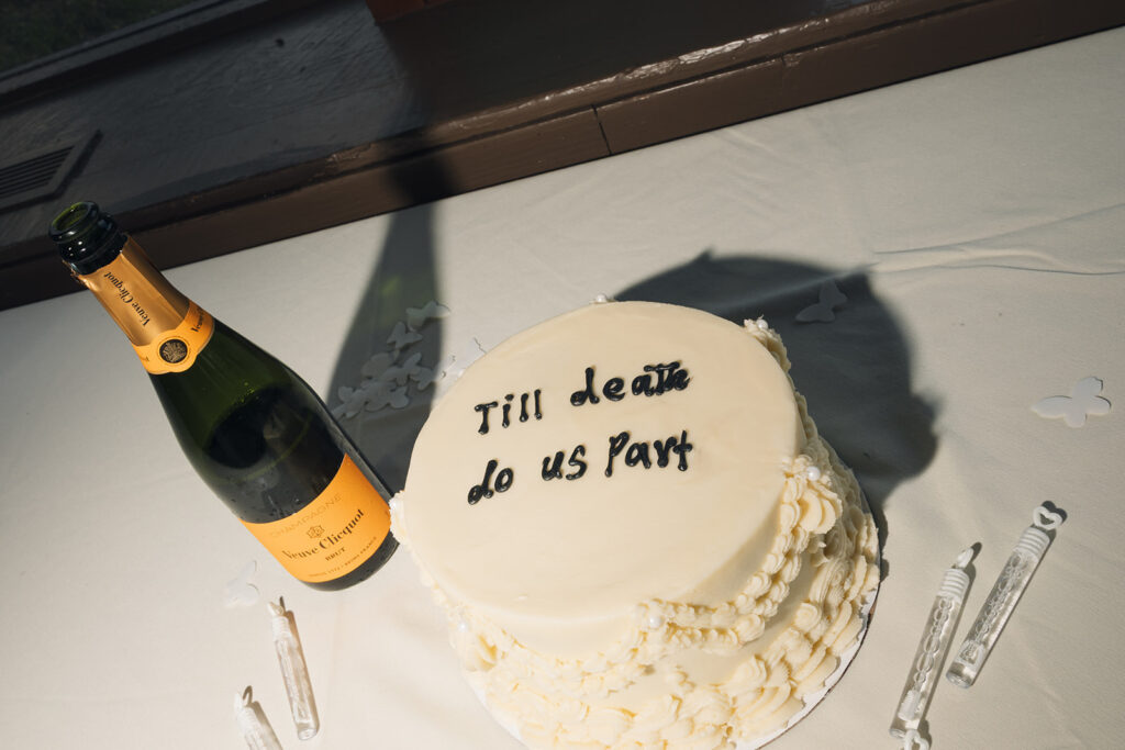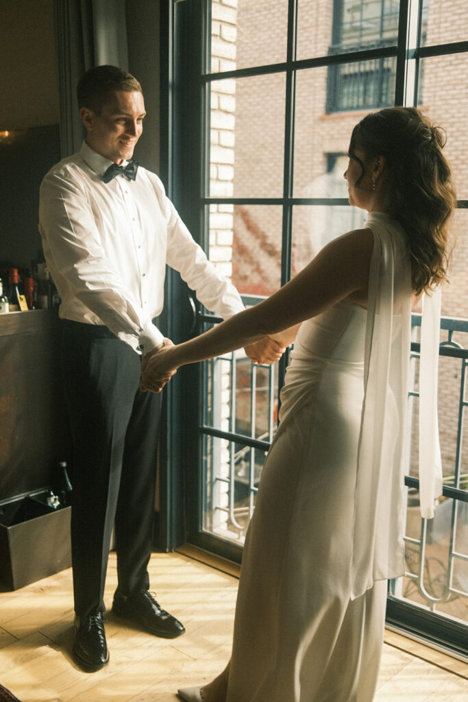 After the hike, the day settled into something slower and more intimate. One of my favorite details was Leslie’s bouquet. Instead of a traditional design, she chose a sculptural, bag-shaped design that felt modern. It added a subtle edge to the day and fit perfectly with the clean winter palette and elevated feel. We also created some space for them to have a moment during their marriage license signing in the hotel room.